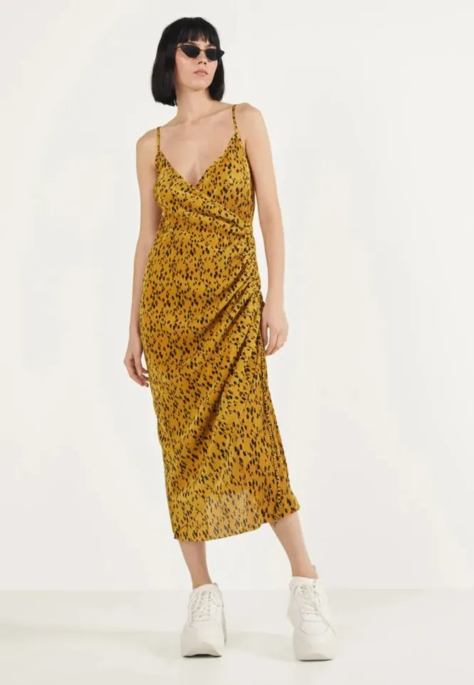 Пожалуй, самый универсальный вариант на лето — платье-комбинация с цветочным принтом. Оно подойдет как для обычной прогулки, так и для выхода в свет. Такую модель можно носить с любой обувью: с кроссовками и кедами, мюли и сандалиями, босоножками и лодочками — выбирай вариант, исходя из случая. В прохладную погоду ты можешь накинуть сверху объемную джинсовку или бомбер, а можешь и вовсе надеть под платье тонкую водолазку. Драпировки на талии и бедрах делают фигуру еще более выразительной, а также зрительно вытягивают силуэт.