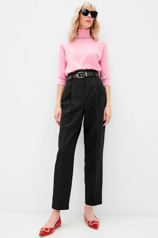 Классика жанра — брюки-бананы — славятся своим свойством визуально преображать фигуру. Высокая посадка и акцентный пояс делают талию тоньше, объем в области бедер придает телу выразительности, а защипы и стрелки зрительно удлиняют и стройнят ноги. Идеальный выбор!