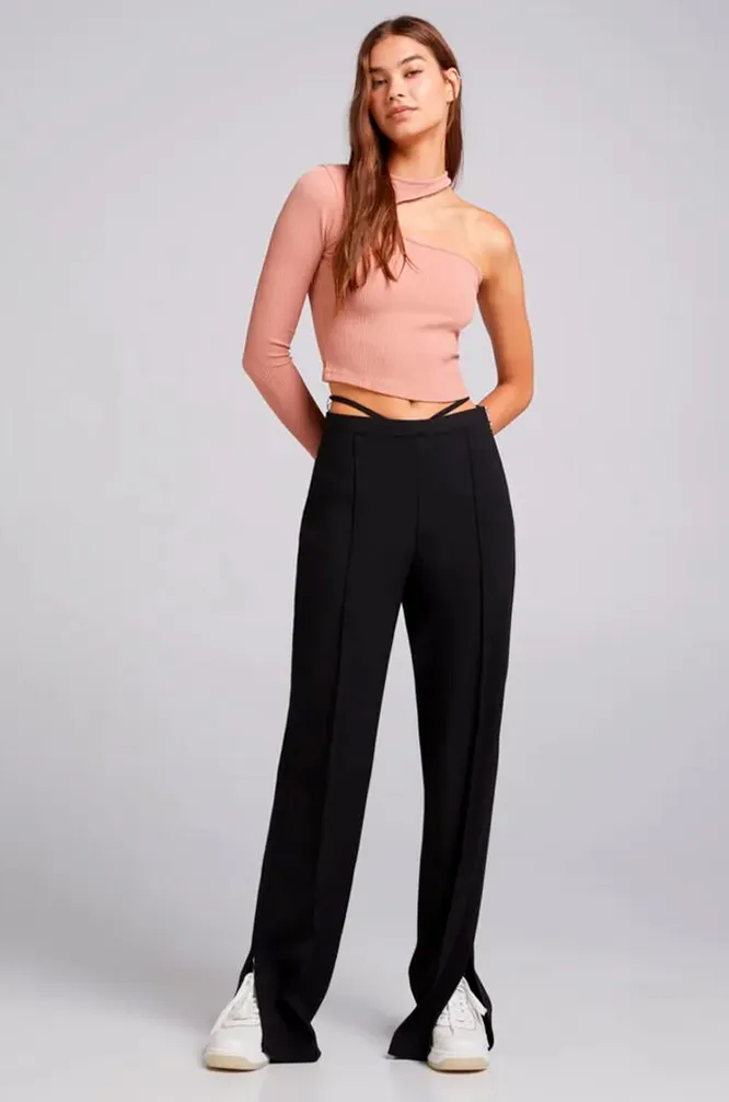 Посадка ниже линии талии приоткрывает пупок, а декоративная цепь сбоку делает наряд визуально более дерзким. Для вечеринки или встречи с друзьями такая модель станет идеальной базой.