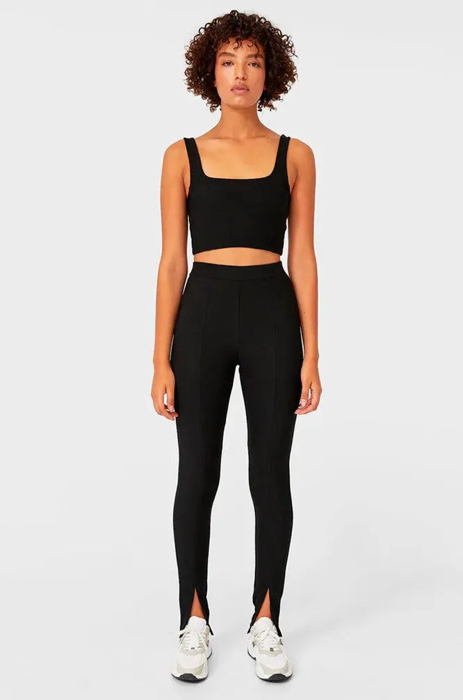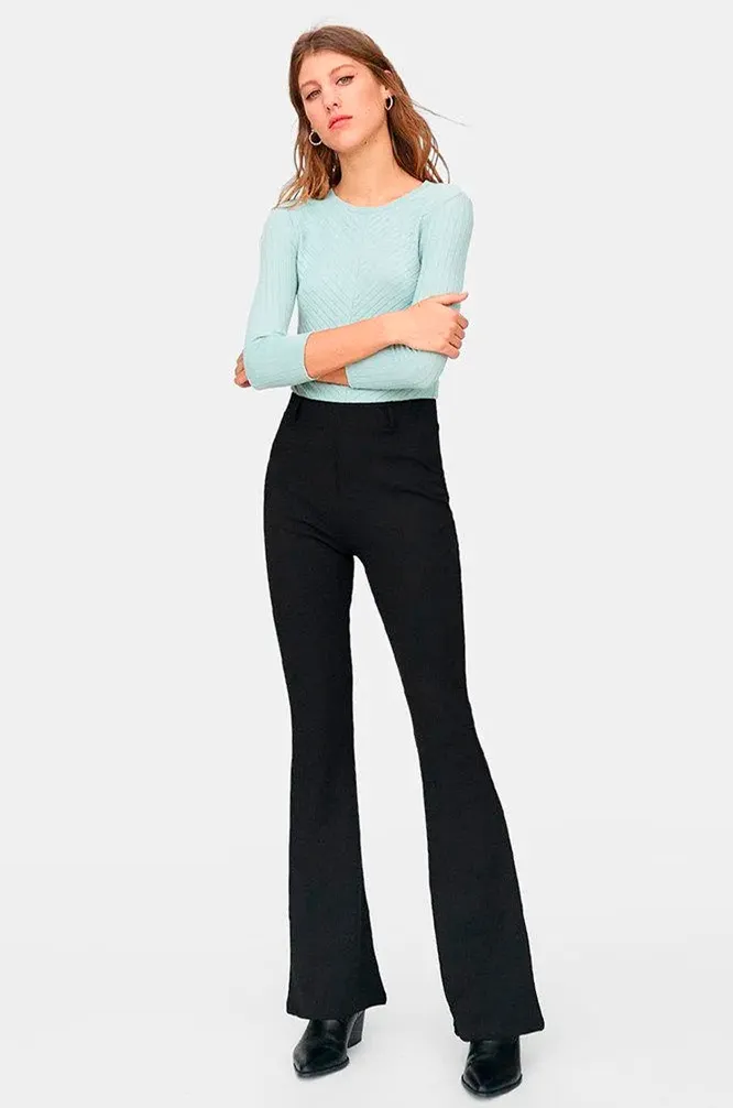 Брюки-клеш визуально вытягивают ноги и делают их стройнее. Чтобы эффект сработал, сделай ставку на высокую посадку — это не только поможет удлинить силуэт, но еще и подчеркнет талию. В этом сезоне выбирай плавный клеш и избегай моделей со слишком резко расширяющимися штанинами.