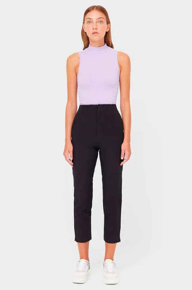 Выбирая укороченные брюки, главное, угадать с длиной. Чтобы не обрезать ноги и не сделать их полнее, край штанины должен заканчиваться в узкой части и открывать щиколотку.