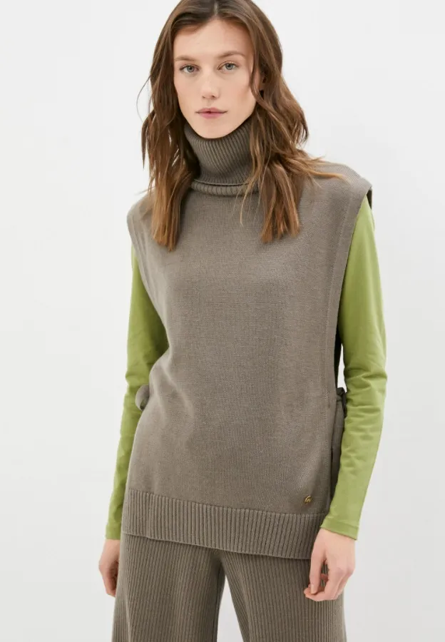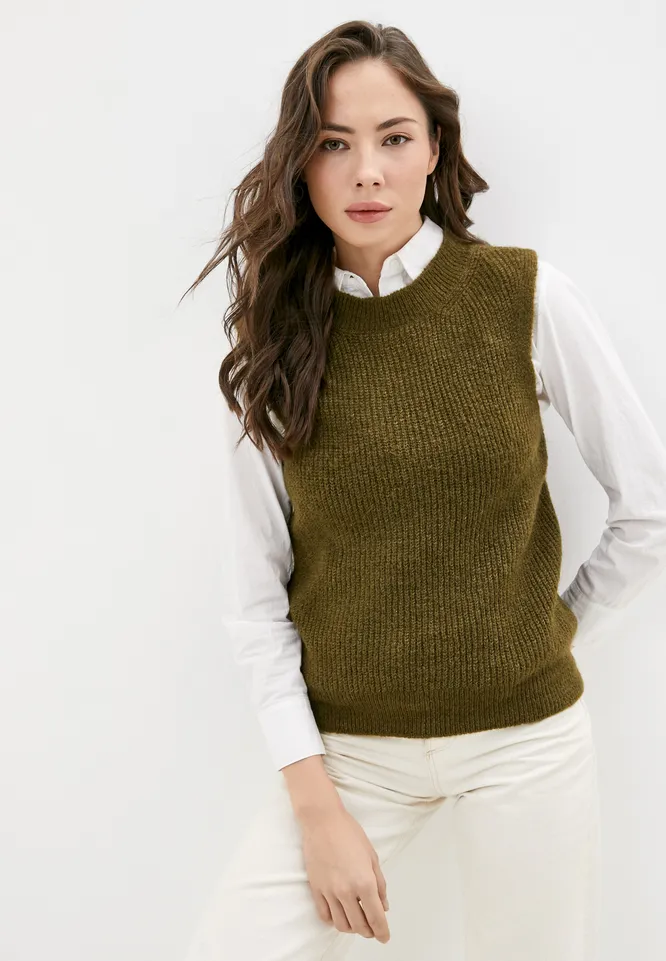 Если ищешь что-то простое и лаконичное, обрати внимание на модный вязаный женский жилет цвета хаки с круглым вырезом. Он хорошо миксуется со многими вещами, поэтому его легко интегрировать в разные образы: от повседневных до деловых. Можно носить его поверх белой рубашки с джинсами или со строгими брюками, использовать как базу под пиджаки или кардиганы.
