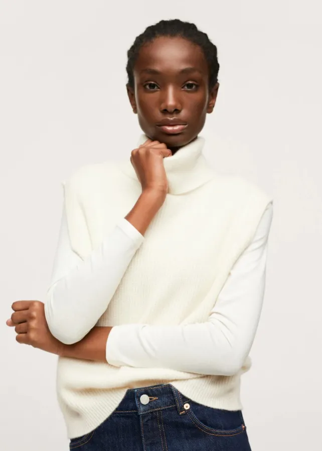 Альтернатива свитеру — модный вязаный жилет — 2021-22 молочного цвета из натурального кашемира. Он мягкий, легкий, приятный к телу и очень теплый. Идеально впишется в простые образы в стиле скандинавского минимализма. Ты можешь надеть его с базовым лонгсливом, широкими брюками в пол и массивными кроссовками или замиксовать с однотонной водолазкой и длинной юбкой А-силуэта.