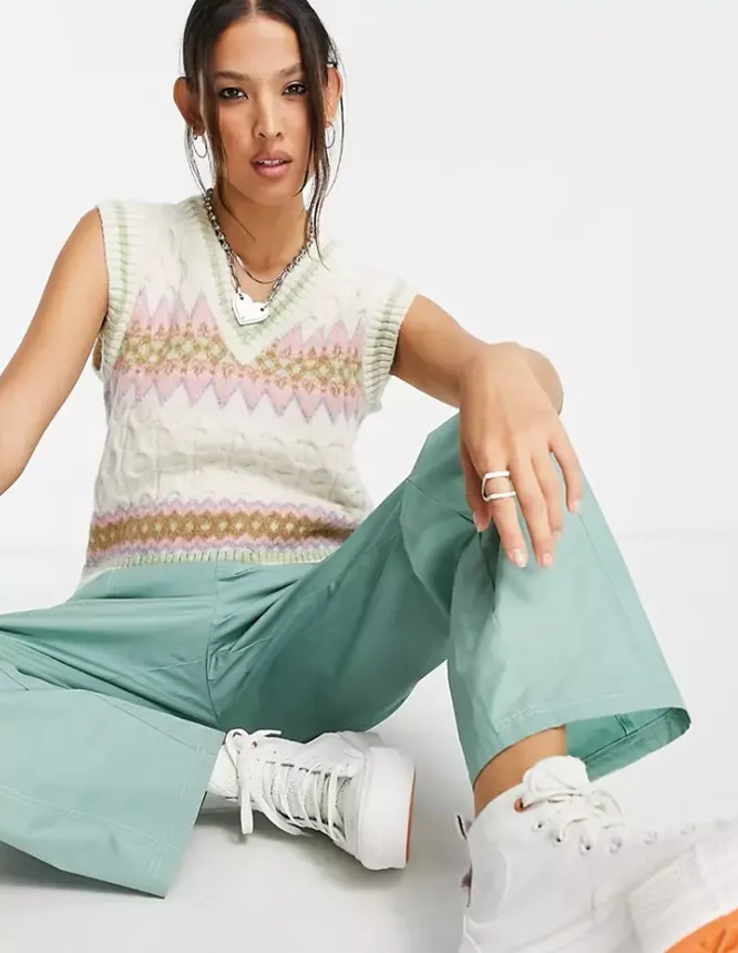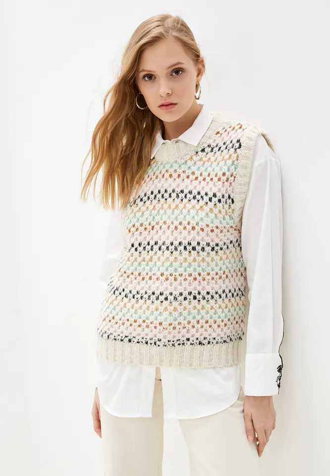 Если ищешь что-то более спокойное и нейтральное, обрати внимание на вязаный женский жилет в пастельных тонах с незамысловатым узором. Дополни его воздушной блузой, струящимися брюками или юбкой А-силуэта – получится романтичный образ, который идеально завершат остроносые ботильоны или жокейские сапоги. Для создания более сложного аутфита дополняй безрукавку кожаными брюками и грубыми ботинками.