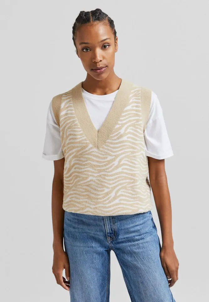 Разнообразить повседневный casual-лук поможет женский вязаный жилет с нейтральным зебровым принтом. Модель органично смотрится с белыми, бежевой, бордовой, пастельной рубашкой или футболкой. Жилет можно носить на голое тело с базовыми джинсами, повседневной юбкой или брюками. Кроме того, он — отличная основа под любой пиджак или объемный кардиган.