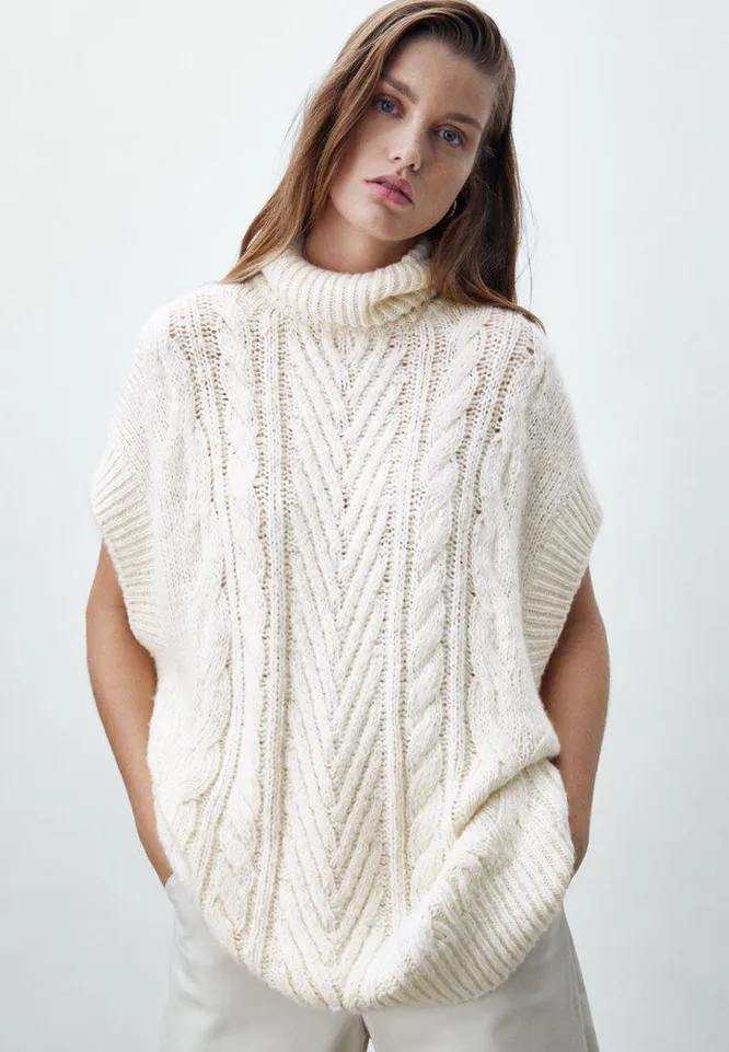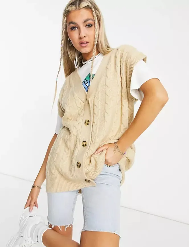 Жилет фактурной вязки поможет структурировать образ в стиле оверсайз. Если нужно расставить дополнительные акценты, добавь массивное ожерелье и фактурную сумку.