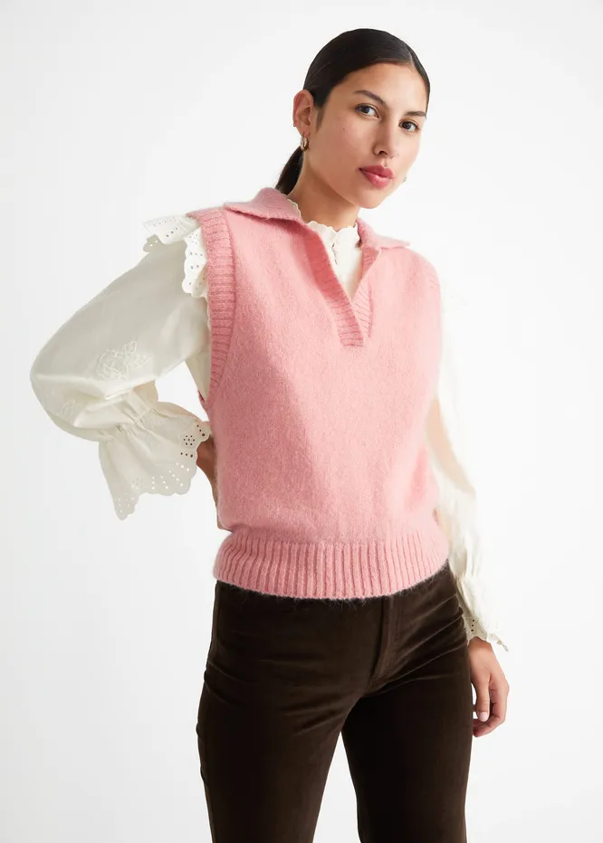 Еще одна вариация модного вязаного жилета для женщин — 2021-22 – с треугольным вырезом. Наш первый фаворит – розовая безрукавка из шерсти и мохера с модным в этом сезоне воротником поло. Она стильно смотрится с расслабленными футболками, базовыми водолазками, классическими рубашками и романтичными блузами. Дополнить образ можно вельветовыми или кожаными брюками клеш, мини-юбкой полуприлегающего кроя, однотонными темно-синими джинсами.