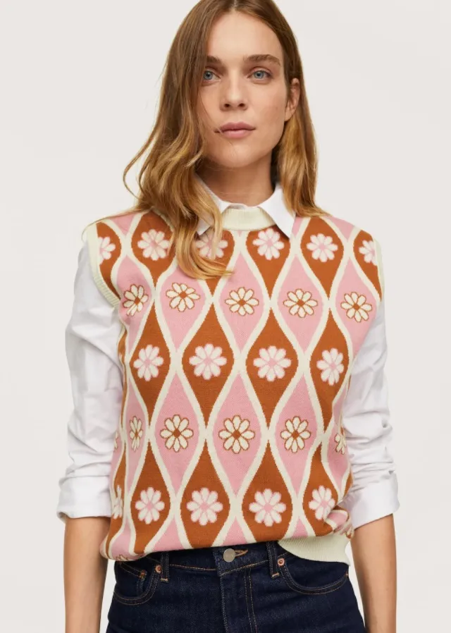 Особое внимание в этом сезоне стоит обратить на вязаные жилеты с флористическими мотивами. Для осени и зимы идеально подойдет безрукавка с крупным цветочным паттерном в приглушенных оттенках. Дополняй жилет нейтральными однотонными вещами, чтобы он стал изюминкой образа. Однако если хочешь добавить еще один принт, мы бы посоветовали крупную клетку, геометрические орнаменты и полоску.