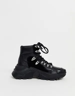 А вот интересная модель в черном цвете, дополненная контрастными красными шнурками, создающими акцент. Высокая рельефная подошва идеально подойдет на зиму: с ней тебе не будет скользко, а ноги не промокнут в сырую погоду.