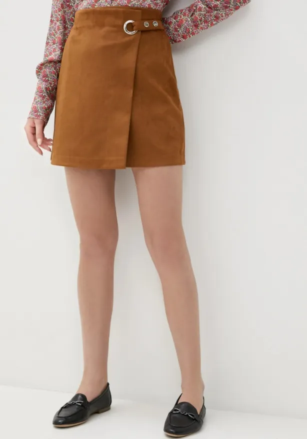 Подчеркнуть талию и сформировать женственный силуэт поможет короткая юбка с запахом. Мы выбрали модель из искусственной замши базового цвета кэмел. Добавь к ней структурированную рубашку, черные плотные колготки, лаконичную пару обуви – простой, но стильный лук на каждый день готов. Если хочешь пойти в этой юбке на вечеринку – дополни ее атласным топом в бельевом стиле и удлиненным блейзером с жесткими плечами.