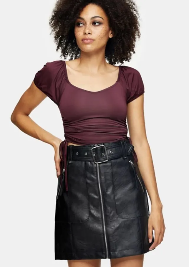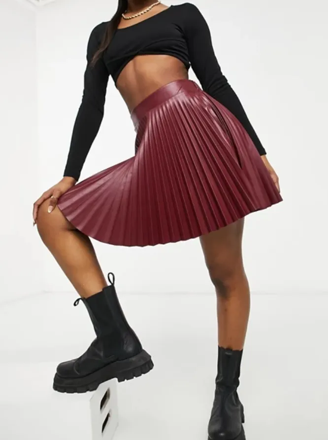 Хочешь дерзкий образ? Выбирай короткую черную юбку из кожи и сочетай ее с кроп-топом в тон и высокими грубыми ботинками на шнуровке и тракторной подошве. Можно добавить колготки в сеточку, массивную цепь на шею, акцентный ремень и удлиненный кожаный блейзер.