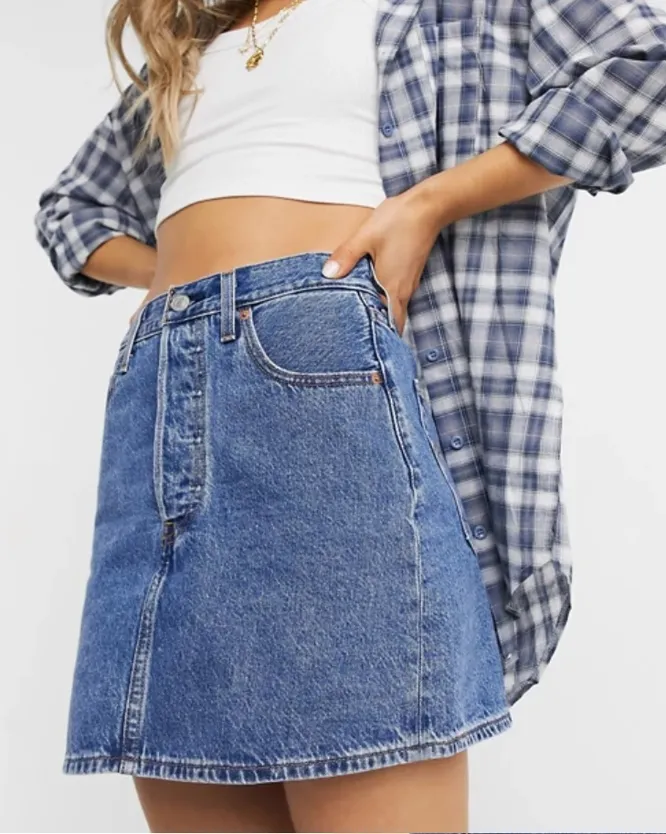 Универсальная модель на каждый день – джинсовая мини-юбка. С ней легко сочетаются практически любой верх и аксессуары. Надевай ее с объемный свитшотом и массивными городскими кроссовками – получишь модный casual-аутфит для неформальных встреч. В офис предлагаем носить ее с плотными колготками, водолазкой, клетчатым блейзером и кожаными лоферами.