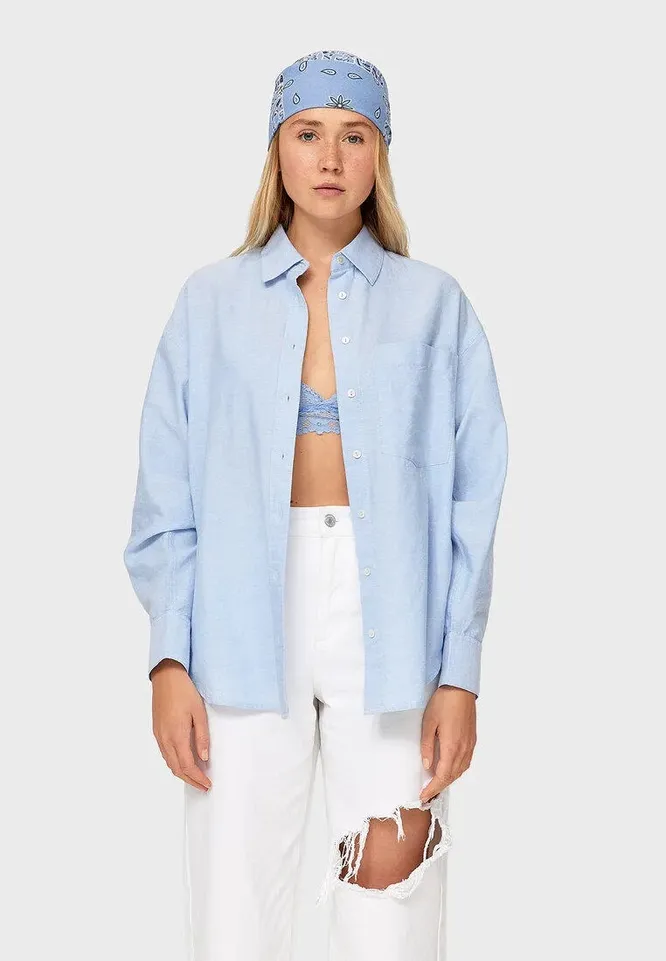 Отличная альтернатива белой модели — рубашка голубого цвета. Смотрится не так строго, но при этом отлично подходит как для офиса, так и для менее формальных поводов.