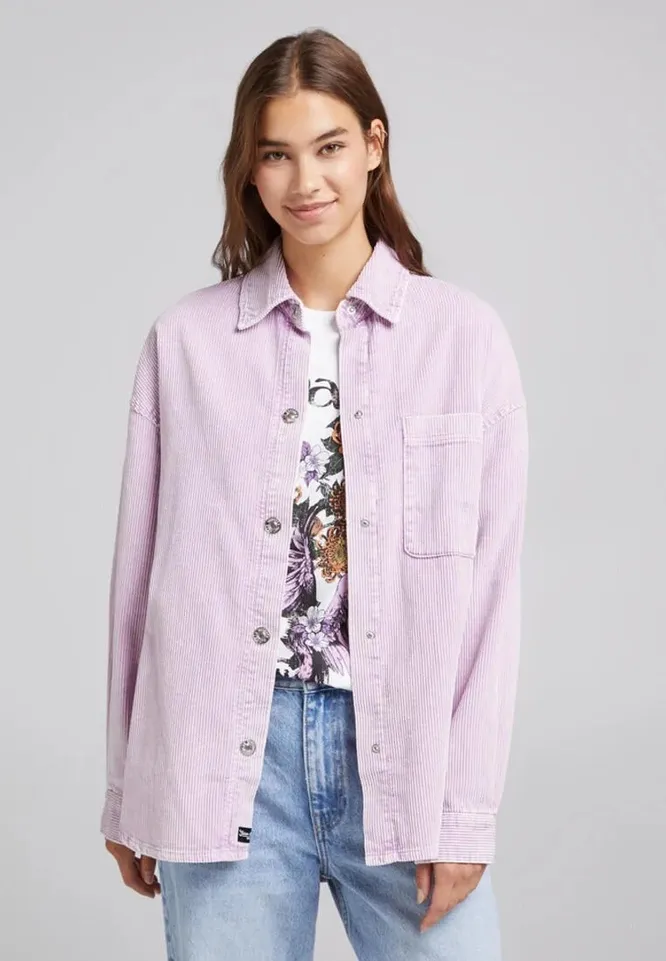 Еще один отличный вариант верхней рубашки. Ее ты сможешь накинуть на плечи в прохладную погоду, причем как на легкую футболку, так и на плотное худи — главное, выбирать модели свободного кроя. Чтобы визуально смягчить образ с объемной вельветовой рубашкой, сделай ставку на нежные оттенки, например, модный в этом сезоне лавандовый.