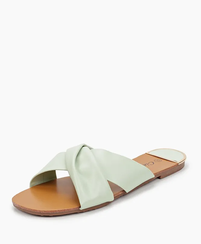 Шлепанцы шалфейного цвета можно носить с льняными бермудами и кроп-топом, однотонным сарафаном, джинсами и футболкой.