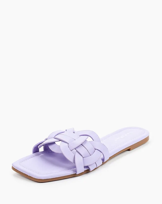Всегда стильно и необычно смотрится сиреневая обувь. Мы подобрали для тебя лавандовые шлепанцы с кожаным плетением и квадратным мысом.
