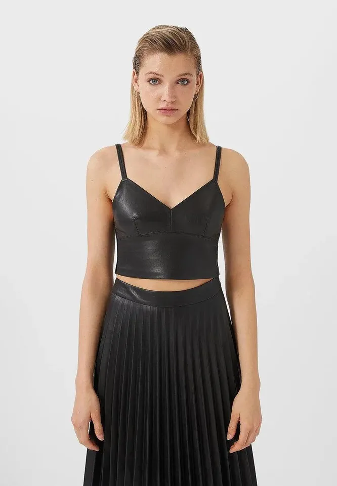 Для поклонниц дерзких образов мы нашли стильный кожаный топ на тонких лямках. Кожа — хит последних нескольких сезонов, который, кажется, совсем не собирается покидать свое место на модном Олимпе (а мы и не против). Добавляй к нему джинсы и юбки любого кроя, или брюки, как строгие, так и спортивного стиля. V-образный вырез и тонкие бретели помогут тебе выглядеть еще более утонченно, подчеркнут шею, ключицы и линию декольте.