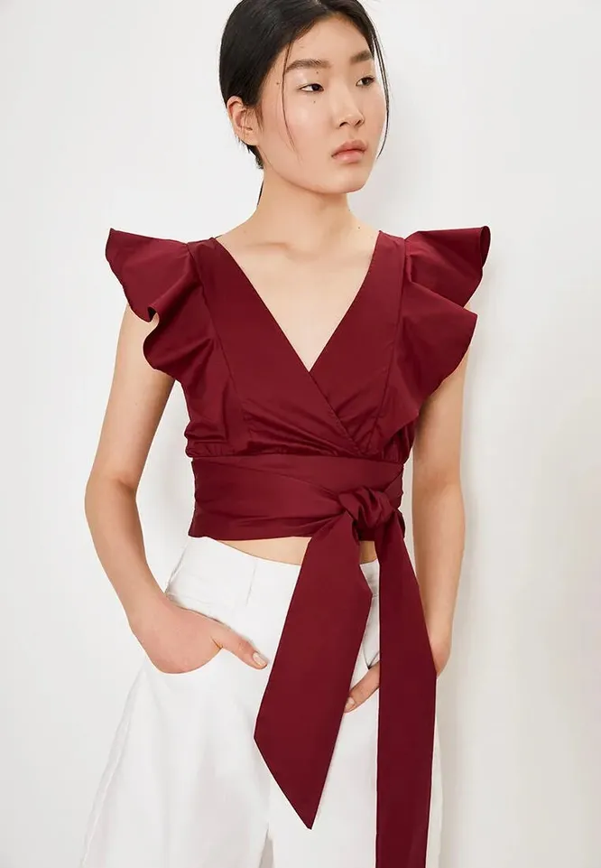 Изюминка этой модели – запах: такой крой визуально стройнит и удлиняет силуэт, а также делает акцент на талии. Гармонично кроп-топ смотрится с расклешенными брюками и туфлями-лодочками на среднем каблуке. Не забудь дополнить образ стильным клатчем или мини-сумочкой через плечо — наряд романтичной леди готов.