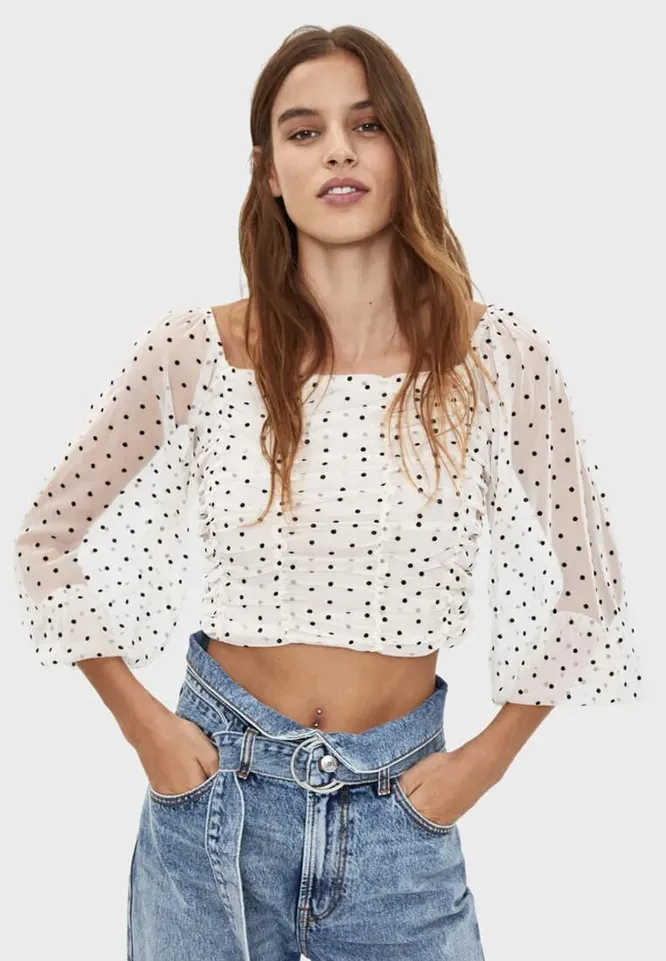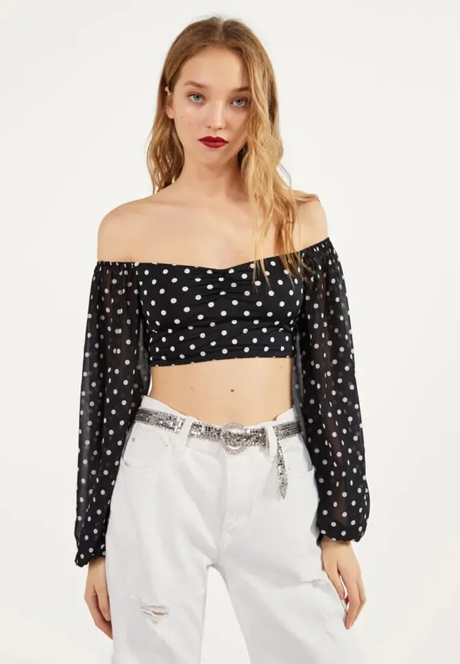 Еще одна очень женственная модель — кроп-топ в горошек с летящими рукавами. Отличный вариант для прогулки с подругами и для романтического вечера. Комбинируй с джинсами, атласной юбкой или сыграй на контрасте, дополнив кожаными брюками. Не стоит слишком увлекаться аксессуарами — это утяжелит образ. В качестве детали можешь использовать массивный ободок или крупные золотые заколки.