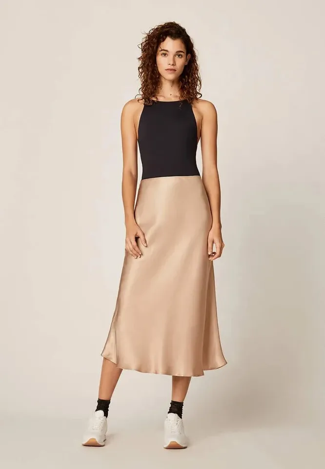 Для романтической встречи или элегантного выхода в свет выбирай атласную юбку ниже колена. Советуем присмотреться к моделям нежных оттенков: лучше всего подойдут бежевая, розовая, голубая. Такую юбку можно сочетать как с вещами из той же стилистики – романтичные топы и лодочки kitten heels, так и с одеждой на контрасте — яркий свитер и грубые ботинки добавят характер твоему наряду.
