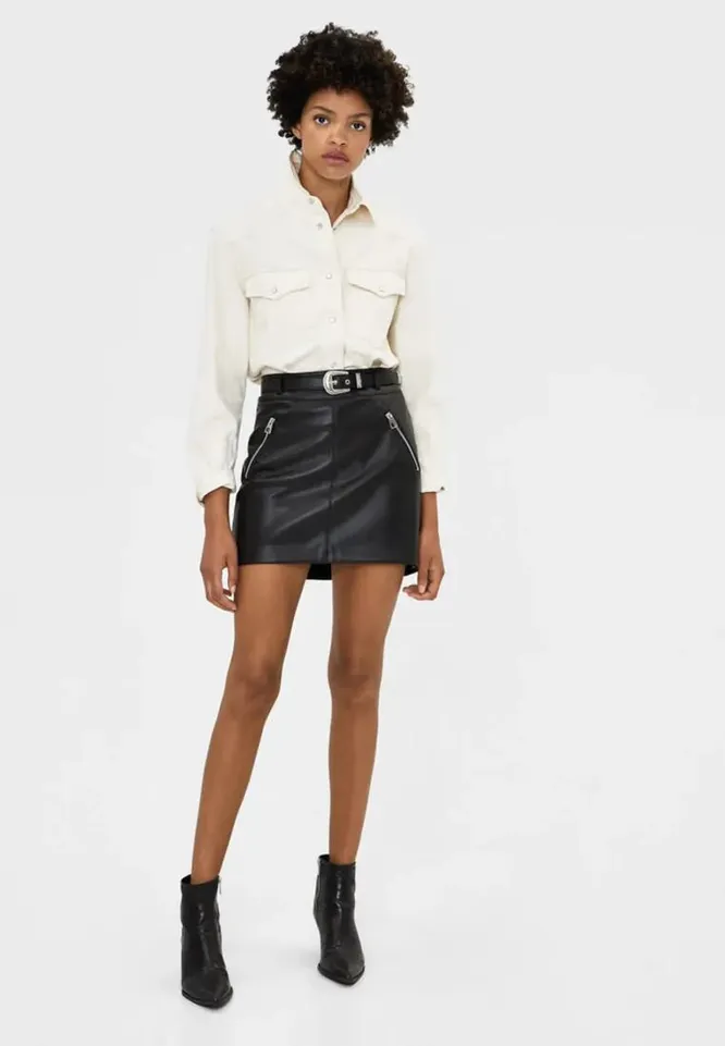 Составить дерзкий роковой образ тебе поможет кожаная юбка. К выбору длины стоит подойти индивидуально в зависимости от твоих пропорций. Такая модель прекрасно впишется в повседневный гардероб, послужит основой для коктейльного образа, а также дополнит деловой наряд в офис. Из обуви подойдут как модели на каблуке, так и ботинки на низком ходу.