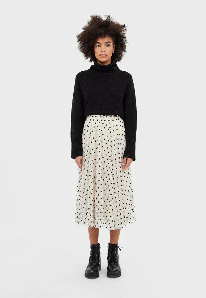 Хорошие новости для романтиков — горошек в моде, не опять, а снова. Носи в этом сезоне воздушные юбки из струящихся тканей, декорированных принтом полька-дот. Чтобы сделать образ чуть острее и интереснее, подбери к нему контрастные аксессуары и обувь. Например, идеально впишутся ботинки на шнуровке и сумка с жестким каркасом.
