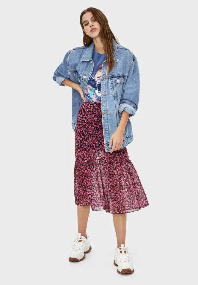 Эта модель послужит отличной базой для образа девочки-бунтарки. Не бойся играть на контрасте и смело сочетай воздушную юбку в цветочек с хлопковой футболкой, белыми кедами и джинсовой курткой с мужского плеча. Не сомневайся, этот наряд станет одним из твоих любимых этим летом.