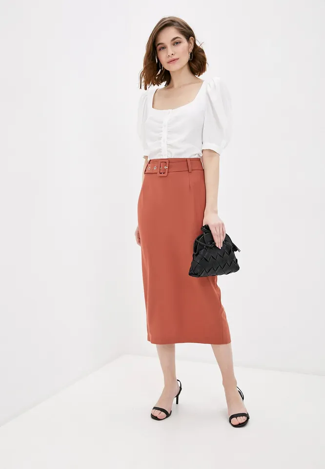 Классическая юбка с широким поясом подойдет на любой случай, будь то деловая встреча, романтическое свидание или поход с подругами по магазинам. Лаконичный крой и спокойный оттенок ткани позволяют подобрать к этой модели любые верх и аксессуары. Особенно эффектно с ней будут смотреть блуза с пышными рукавами и босоножки с квадратным мысом.