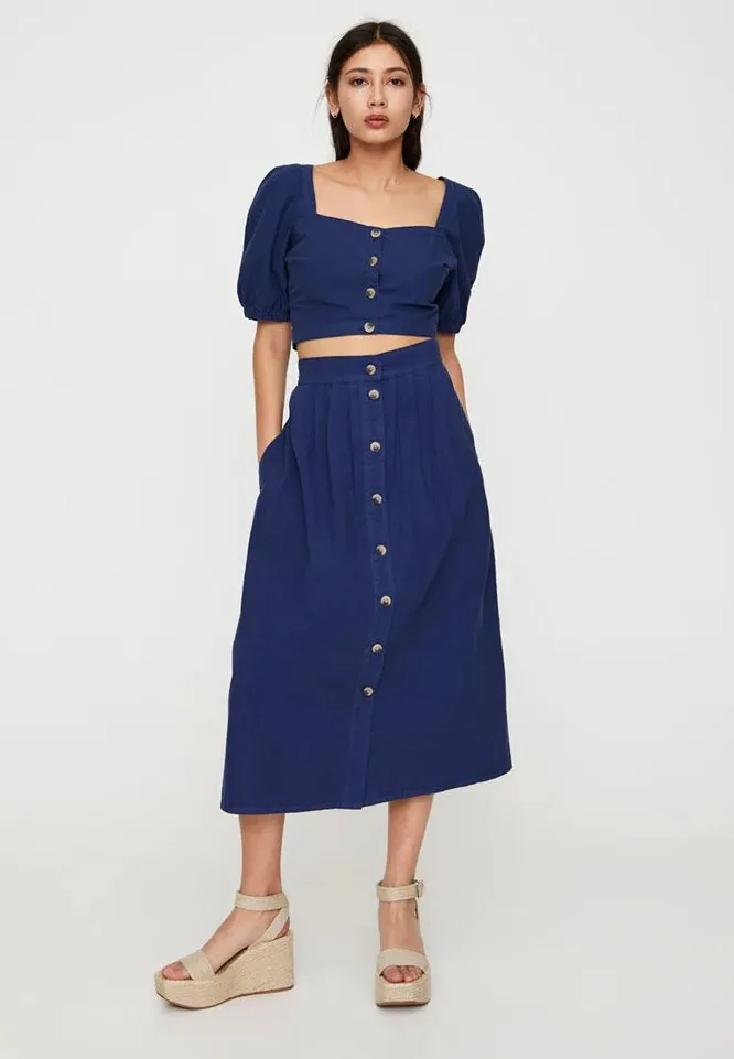 Легкая юбка насыщенного синего оттенка декорирована пуговицами по центру. Высокая посадка акцентирует талию, а свободный крой скрывает широкие бедра. Такая модель идеально подходит для встречи с подругами или неспешной прогулки в парке с бойфрендом. Подбери к ней укороченный топ и модные в этом сезоне сандалии на толстой подошве — яркий и комфортный лук на лето готов.