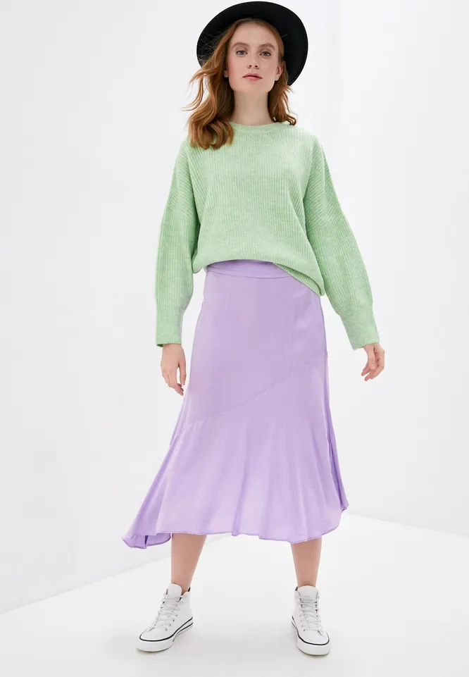 Создать яркий акцент в твоем образе поможет лавандовая юбка миди летящего кроя. Модель с асимметричным низом поможет тебе подчеркнуть длину ног и визуально вытянуть силуэт. Носить ее можно как с каблуками на вечер, так и с обувью на низком ходу каждый день. Будь уверена: в такой юбке ты точно не останешься незамеченной.