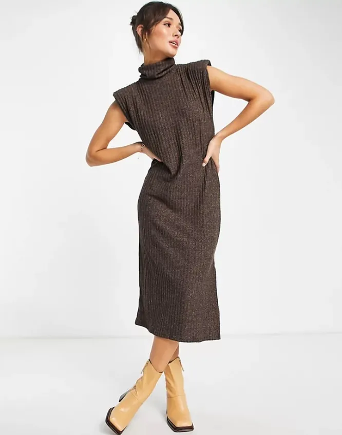 Фаворит многих модниц мира – вязаное платье-свитер без рукавов. Мы выбрали модель универсального коричневого цвета длины миди. На вечеринку надевай его на голое тело и дополняй сапогами-гармошками на каблуке, массивными браслетами и акцентными сережками. В повседневной жизни предлагаем комбинировать его с водолазкой, базовым лонгсливом, рубашкой или трикотажным джемпером. При желании можно добавить кожаный ремень или трикотажный пояс в тон.