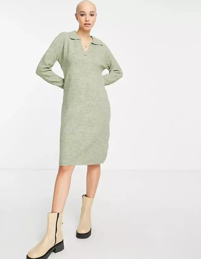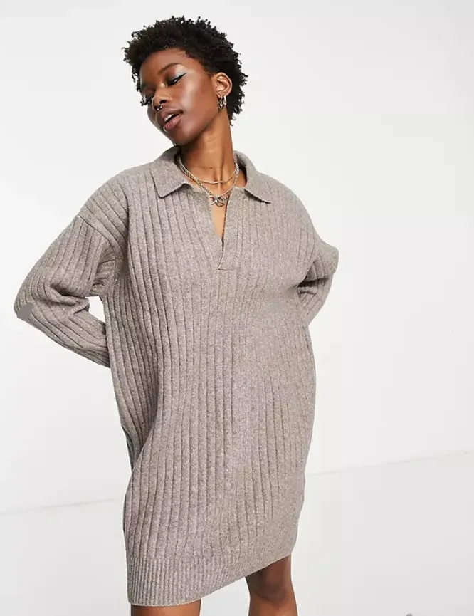 Один из трендов текущего сезона – воротник поло, советуем купить это платье-свитер в интернет-магазине, чтобы не отставать от модных тенденций. Оверсайз-крой, модный воротник, нейтральный цвет – это платье идеально впишется в любой будничный лук. Попробуй подружить его с дерзкими кожаными сапогами на каблуке или замиксуй с белой рубашкой оверсайз, плотными колготками или легинсами и высокими казаками.