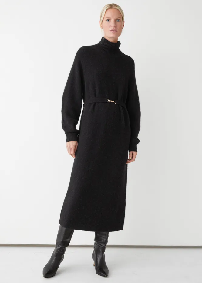 Если ищешь что-то максимально теплое и практичное, выбирай длинное черное платье-свитер. Модель выполнена из шерсти и альпаки, имеет высокий ворот и расслабленный крой. Можно надеть его с кожаными сапогами или ботинками на шнуровке. Для создания более элегантного аутфита дополняй его изящными ботильонами на каблуке. Также платье органично смотрится и с массивной городской обувью. В качестве дополнительных аксессуаров выбирай сумку с жестким каркасом и длинные серьги.