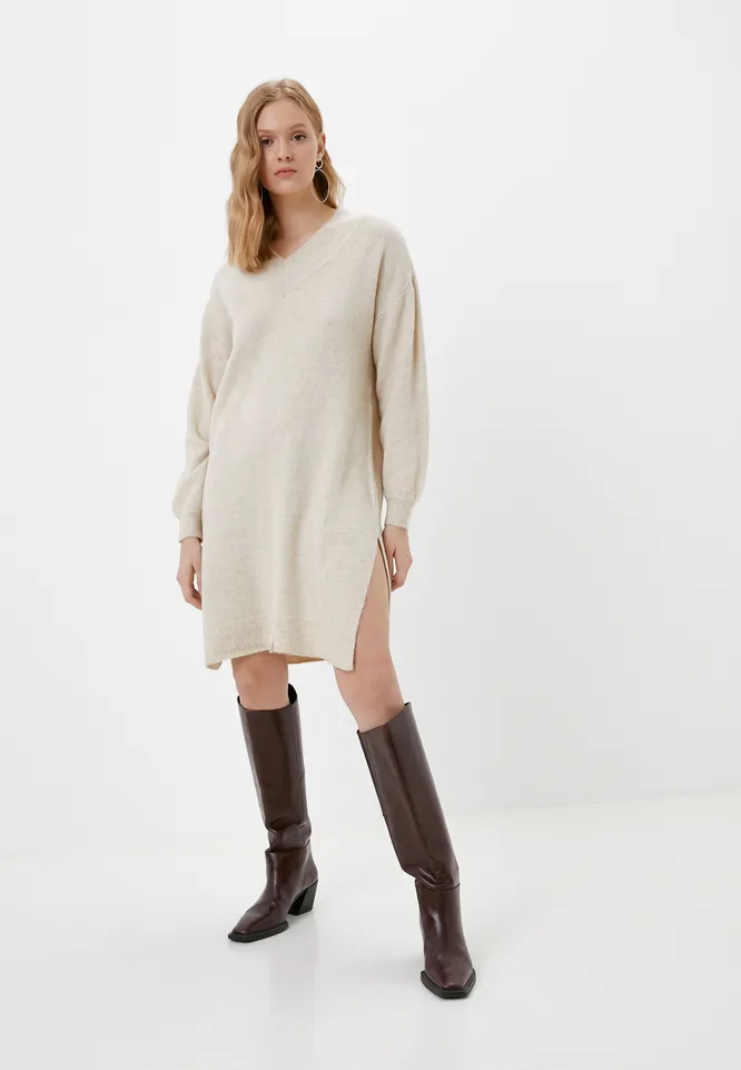 Короткое вязаное платье-свитер с V-образным вырезом и разрезами по бокам не только хорошо согреет, но и станет удачной основой для уютного повседневного образа или модного многослойного аутфита. В первом случае предлагаем носить его поверх водолазки с плотными легинсами и высокими кожаными сапогами. Во втором – сочетать с рубашкой, узкими джинсами, акцентной парой обуви и оверсайз-пиджаком. Нежный светло-бежевый цвет позволяет легко сочетать это трикотажное платье-свитер с другими вещами из гардероба.
