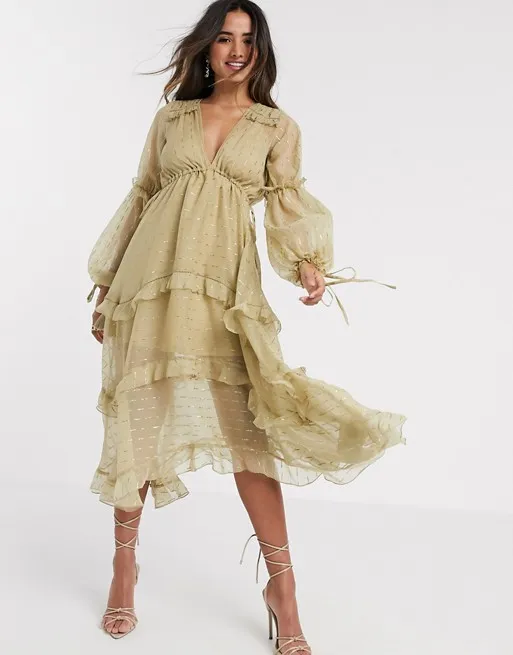 Жаккардовое платье с оборками и асимметричным кроем станет отличным выбором для торжества. Наиболее удачно его дополнят металлизированные аксессуары, например золотые туфли и клатч. В таком платье ты будешь буквально блистать на вечеринке.