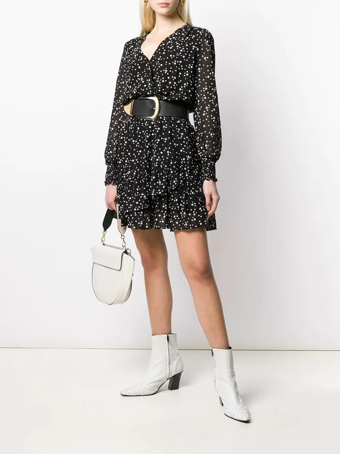 Платье с оборками в горошек — прекрасный вариант для офиса. При желании можно подчеркнуть талию с помощью широкого пояса. Интересно сочетание воздушного платья с пиджаком оверсайз-кроя. Строгие линии жакета уравновешивают оборки и игривый принт.