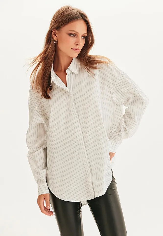 Поклонницам минимализма стоит обратить внимание на эту модель. Рубашка круто смотрится и с узкими, и с широкими брюками.