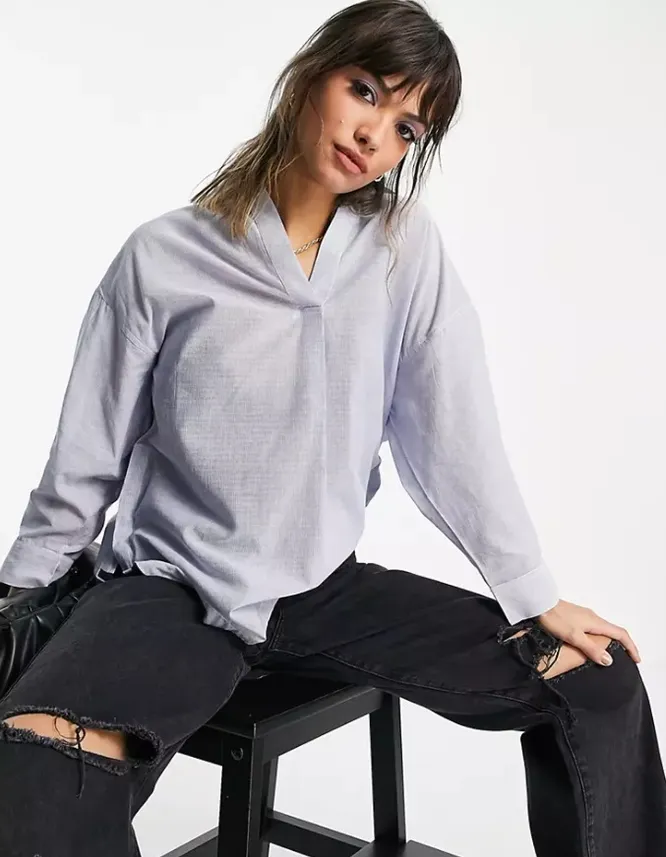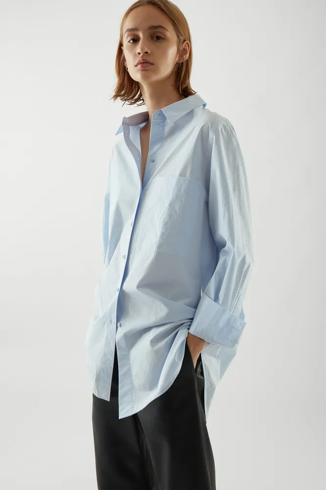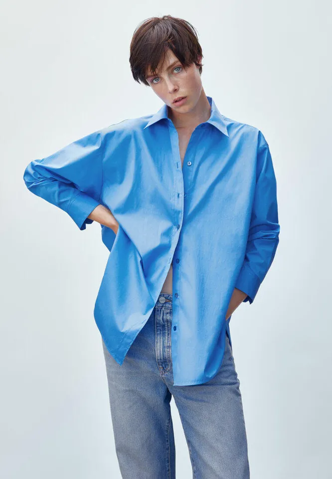 В деловые образы органично впишется светло-голубая оверсайз-рубашка из структурированного хлопка.