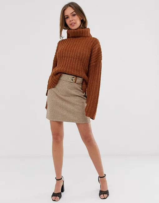 Еще один вариант мини, который можно надеть по любому поводу, будь то деловая встреча или модная вечеринка. Попробуй составить с этой юбкой тотал-лук в бежевой гамме. Для этого подбери объемный коричневый свитер, ботфорты с широким голенищем в тон и длинное оверсайз-пальтов оттенке camel.