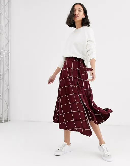 Отличный вариант на каждый день: юбка бордового цвета в крупную белую клетку с посадкой на талии будет гармонично смотреться в сочетании с монохромным джемпером свободного кроя и массивными кроссовками. Также, отличным дополнением к образу станут модные в этом сезоне грубые ботинки — в качестве верхней одежды к ним лучше подобрать оверсайз-дубленку или укороченный, дутый пуховик.