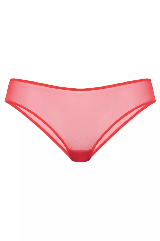 Полупрозрачное белье классического красного оттенка, который идет абсолютно всем. Выбирая эту модель, ты можешь быть уверена, что не прогадаешь. Простой, лаконичный дизайн отлично гармонирует с яркой расцветкой, за счет чего комплект смотрится в меру дерзко и сдержанно.