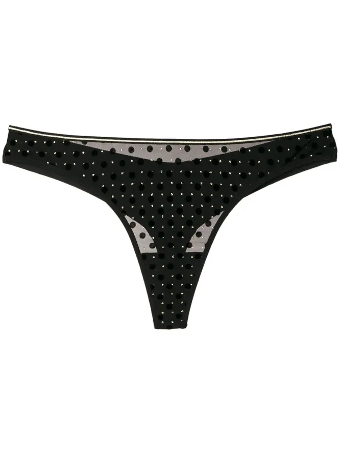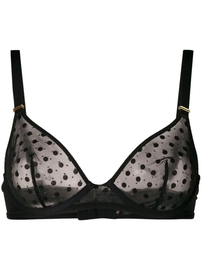 Бралетт на косточках, декорированный вырезами и вышивкой золотыми нитями, отлично сядет на грудь любого размера и обеспечит необходимую поддержку. Кружевные трусики-бразилиана идеально дополнят соблазнительный образ. Дизайн комплекта довольно сложный, поэтому не стоит перегружать его лишними деталями.