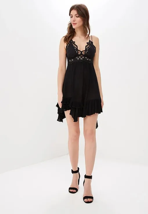 Ужин в курортном ресторане или вечер в баре на берегу моря? Черный приталенный сарафан на тонких бретелях актуален в любом случае. Кружевной лиф с глубоким вырезом подчеркнет грудь, а асимметричный край зрительно вытянет ноги и придаст образу кокетливый вид.