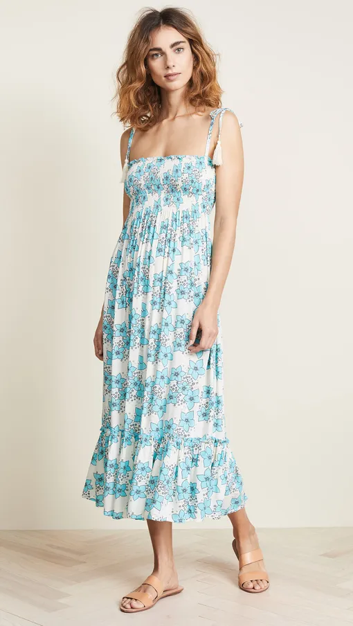 Легкий сарафан усеян голубыми васильками. Завязки с кисточками на плечах добавляют изюминку. Дополни образ нюдовыми вьетнамками и сумкой цвета неба – главный тренд предстоящих сезонов.