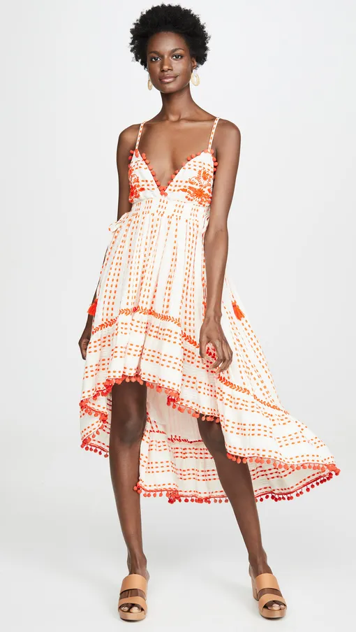 Это яркое и воздушное платье хочется носить, не снимая. Оранжевые рюши и помпоны задают настроение — работает даже в том случае, когда ты встала не с той ноги. Комбинируй с массивными серьгами-кольцами и босоножками с широкими ремешками.