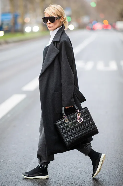 Строгого фасона чёрное кашемировое пальто легко сочетать практически со всеми вещами в гардеробе. В качестве варианта на каждый день мы предлагаем носить его со спортивными брюками и пуловером.
