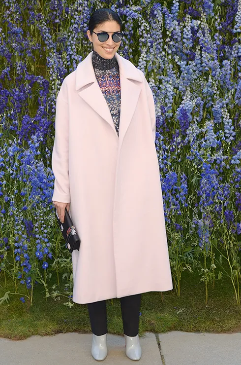 Модель Сара Сампайо предпочитает кашемировое пальто с мехом на рукавах. В своём образе она умело сочетает цвета из песочной, белой и сливочной гаммы. Длинное кашемировое пальто стильно смотрится с широкими брюками и свободным свитером.