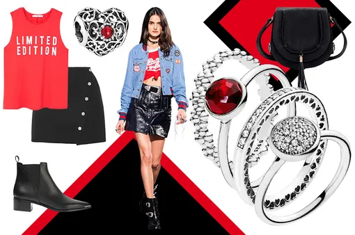Чтобы не сделать модный рок слишком «тяжелым», надень на каждый палец кольца ручной работы PANDORA с синтетическим рубином и горным хрусталем. А за рок-н-ролльную составляющую пусть отвечает топ с надписью, особенно актуальный в этом сезоне, и юбка в стиле 60-х с металлическими пуговицами по длине, нарочито небрежная укладка и, конечно же, сапоги-чопперы или «казаки». И не забудь кожаную куртку-косуху, которая спасет тебя от возможной вечерней прохлады!