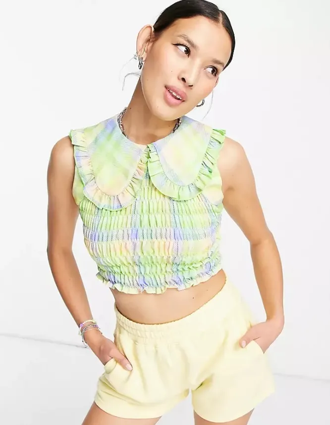 Фактурная укороченная блузка стильно смотрится с шортами-боксерами и сандалиями. Также ее можно интегрировать в наряд с широкими брюками с высокой посадкой.