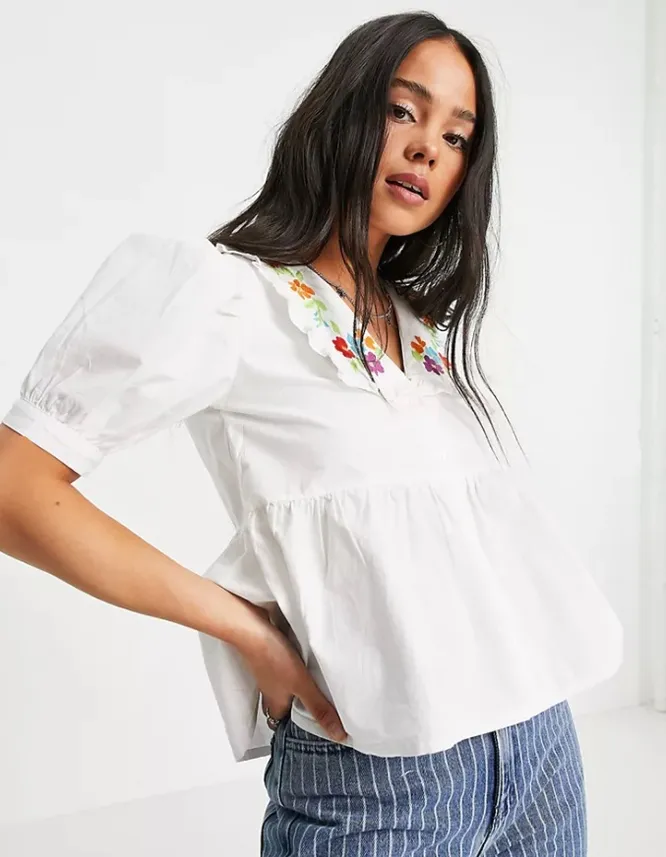 Второй вариант — структурированная блузка с яркой цветочной вышивкой. Добавь к ней пестрые брюки и пару украшений из цветного бисера — модный летний лук готов!